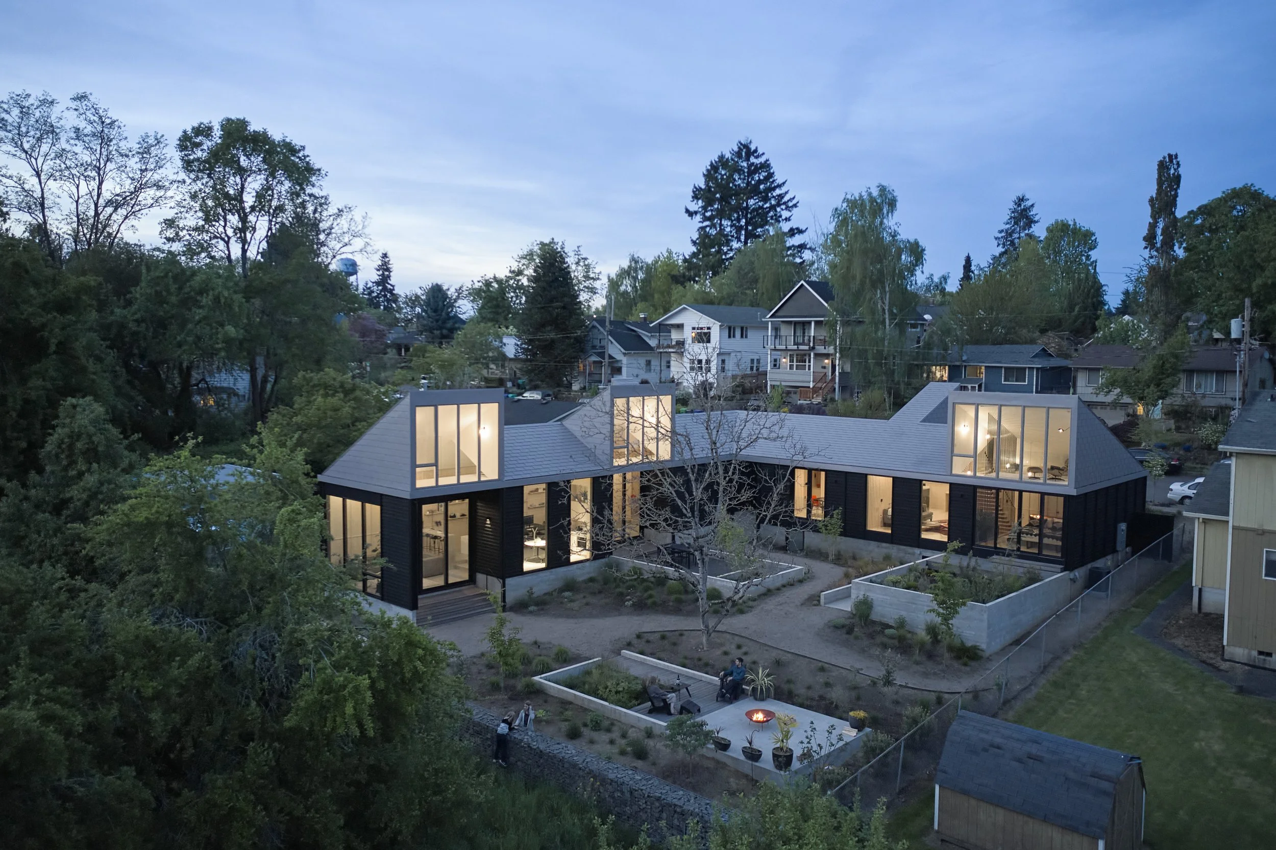 Gradient transforms a postwar house in the St. Johns neighborhood of Portland into a timely and sophisticated live work campus. United by a shared roof and material palette, the house and studio frame a shared courtyard that overlooks the iconic St. Johns Bridge, the Willamette River, and West Hills. Home to a young family with a thriving design business, the Gradient House provides a true live/work balance, with strong connections to neighbors and the landscape, following the natural topography of the site. Though the new house and studio more than double the size of the original house, the scale of the surrounding neighborhood is maintained with façades that are austere but warm, and a system of cedar siding.